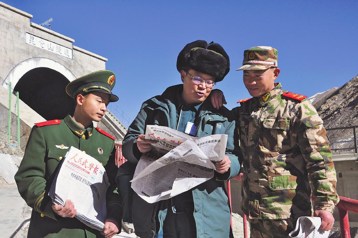 葛軍為駐守在昆侖山隧道的武警戰(zhàn)士送去報刊?!?/p>