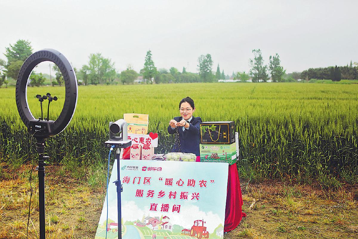 南通市海門區(qū)分公司將“興農(nóng)驛站”直播間設(shè)在田間地頭。(圖片由江蘇省分公司市場部提供)