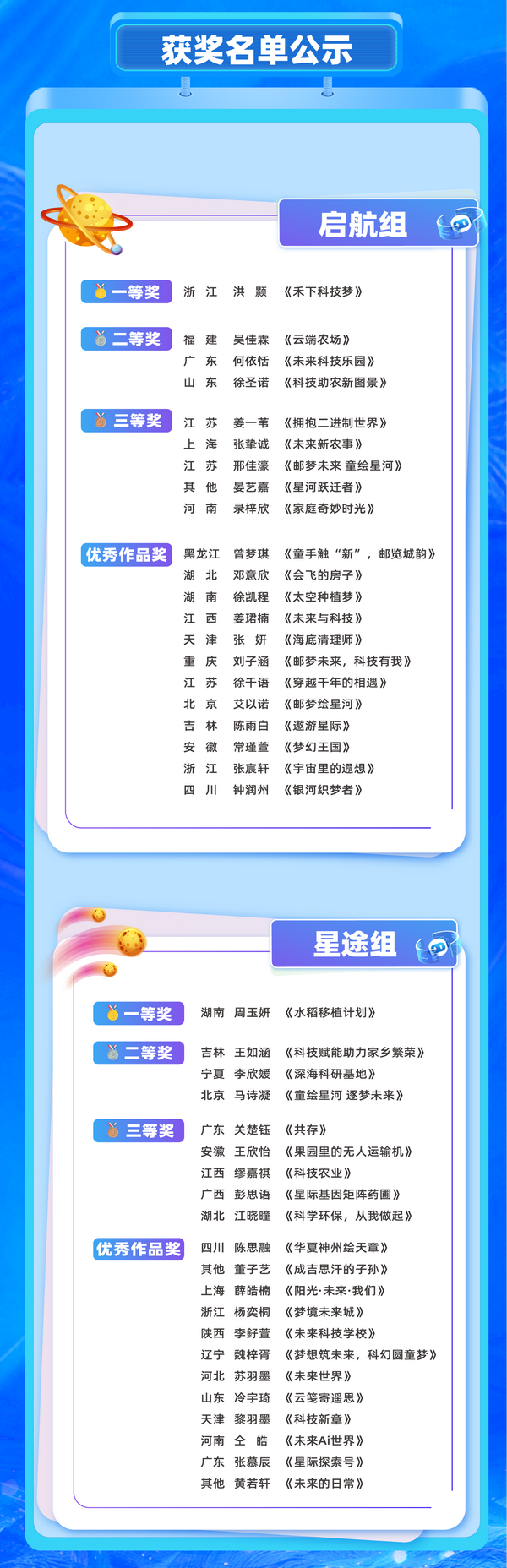 大賽開始以來,得到了社會各界的廣泛關(guān)注與參與,全國23個賽區(qū)共收到8.5萬幅參賽作品,從中推選出230幅優(yōu)秀作品參與全國總決賽的評比。經(jīng)過激烈的角逐和專家評委們的嚴格評審,評審出了“一等獎”2件、“二等獎”6件、“三等獎”10件、“優(yōu)秀作品獎”24件,共計42件獲獎作品。來自全國各地的參賽小藝術(shù)家們手執(zhí)畫筆,在方寸郵票上精心描繪未來科技世界的奇妙圖景,充滿想象力的作品不僅獲得各位評審專家的高度贊譽,更成為展現(xiàn)新時代少兒科學素養(yǎng)與創(chuàng)新活力的亮麗窗口。