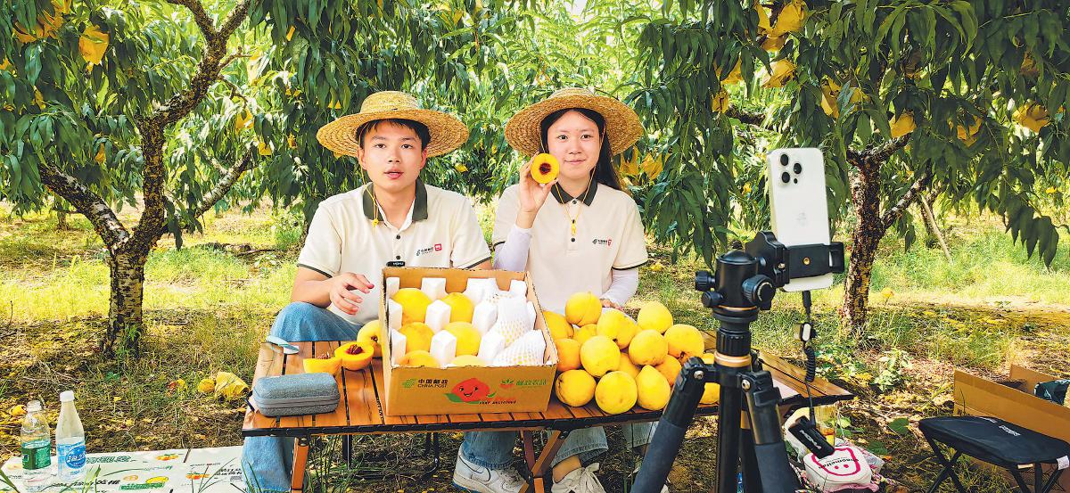 “家人們看過來!我們的桃子都是果農(nóng)們凌晨采摘,帶著露水的新鮮!”近日,在湖北省潛江市總口農(nóng)場(chǎng)果蔬基地的桃樹下,郵政主播拿起一個(gè)個(gè)飽滿圓潤(rùn)的黃桃熱情推介。