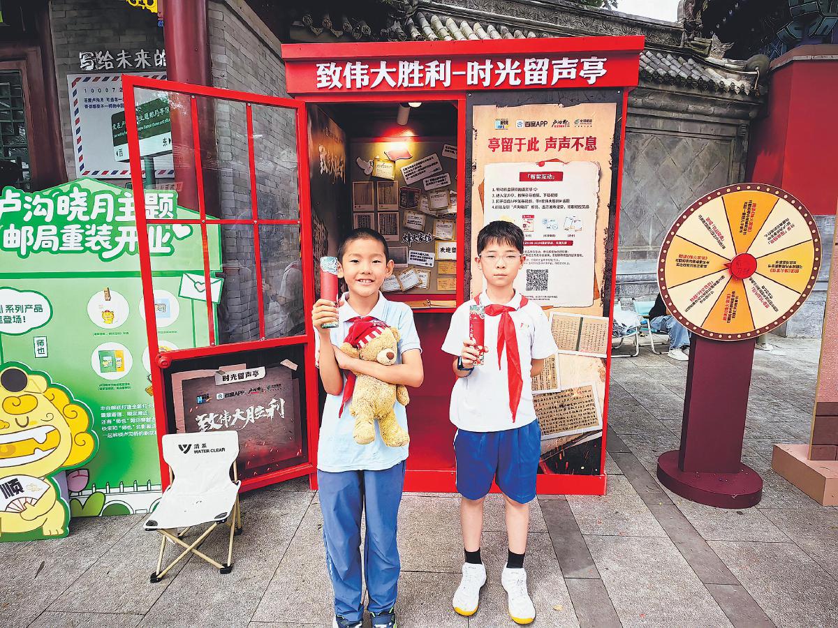 8月15日,“致敬偉大勝利”及烽火家信系列活動(dòng)在北京市豐臺區(qū)宛平城啟動(dòng)。該活動(dòng)由百度App聯(lián)合新華網(wǎng)、軍事博物館、退役軍人事務(wù)部、北京市郵政分公司、盧溝橋文化公園等單位共同舉辦。游客在“致偉大勝利”時(shí)光留聲亭旁,轉(zhuǎn)動(dòng)轉(zhuǎn)盤即可選擇錄制內(nèi)容,包括參觀抗戰(zhàn)展陳的體會(huì)、朗讀一封感人的抗戰(zhàn)家書或唱一首經(jīng)典革命歌曲,產(chǎn)生的優(yōu)質(zhì)視頻素材將由權(quán)威媒體整理后發(fā)布。參加“時(shí)光留聲”錄制的游客還可到旁邊的盧溝曉月主題郵局領(lǐng)取抗戰(zhàn)家書主題明信片,加蓋專屬紀(jì)念戳或購買其他文創(chuàng)產(chǎn)品。