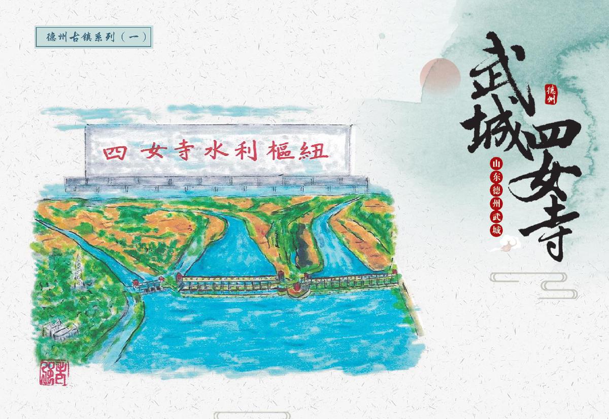 此次首發(fā)的文創(chuàng)產(chǎn)品涵蓋郵資封、明信片、郵資機(jī)宣傳戳及主題宣傳戳四大類(lèi),每一件都浸潤(rùn)著四女寺的文化基因。其中,“四女”郵資封(右上圖)以工筆重彩呈現(xiàn)經(jīng)典場(chǎng)景:畫(huà)面中四位女子于槐樹(shù)下漫步,旁側(cè)牌坊古樸,飛鳥(niǎo)點(diǎn)綴天際,還原“四女侍親,栽槐立誓”的民間傳說(shuō),四女常伴樹(shù)側(cè),行孝事、話桑麻,樹(shù)與人相襯成景,演繹著傳統(tǒng)孝道的溫度,讓古老美德在時(shí)光里熠熠生輝,供后人感懷、傳揚(yáng);而“四女寺水利樞紐”明信片(右下圖)則通過(guò)航拍視角與細(xì)節(jié)特寫(xiě)的結(jié)合,展現(xiàn)這座黃河下游重要水利工程的宏偉氣勢(shì)——堤壩蜿蜒如巨龍伏波,閘門(mén)啟閉間盡顯古人治水的智慧結(jié)晶,讓現(xiàn)代觀者得以觸摸歷史的溫度。