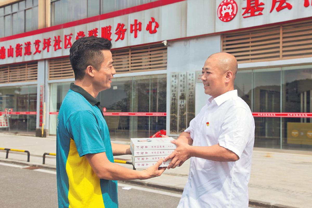 重慶市郵政分公司通過網(wǎng)點重點展示和視頻聯(lián)播宣傳,確保重大主題圖書發(fā)行工作高效推進。圖為江津郵政投遞員為鼎山街道艾坪社區(qū)及時配送《習近平談治國理政》第五卷。□王春蘭 崔卡 攝影報道