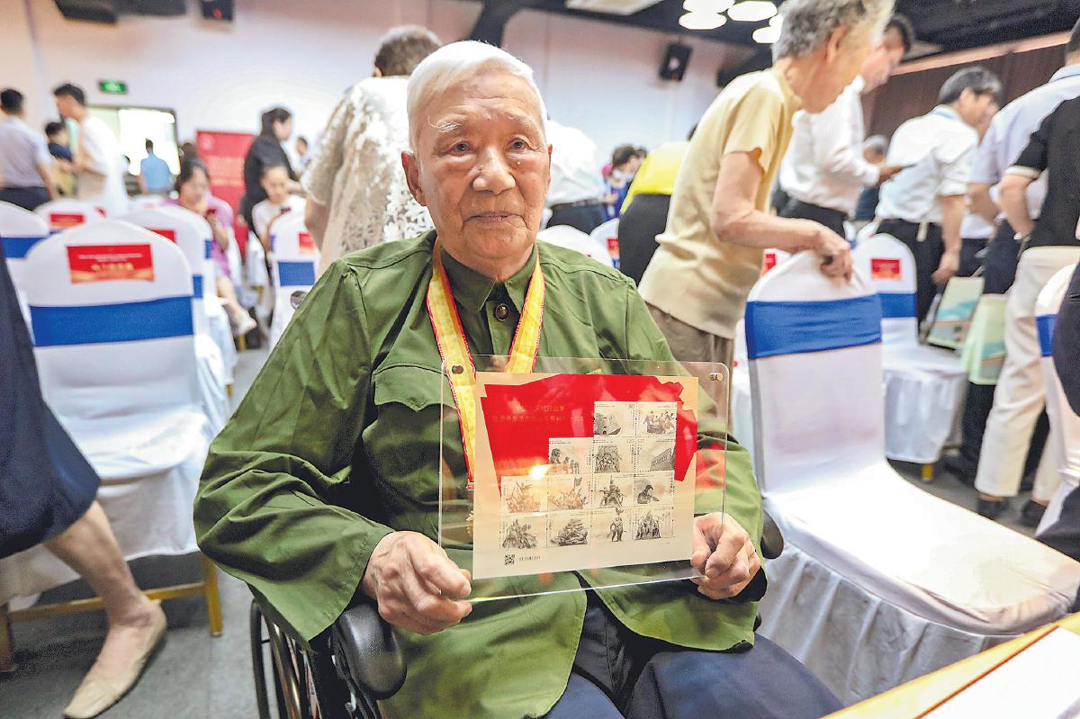 在上海四行倉庫抗戰(zhàn)紀念館隆重舉行的發(fā)行儀式上,主辦方向抗戰(zhàn)老戰(zhàn)士及家屬等贈送了紀念郵品。 □許雨舟 攝影報道