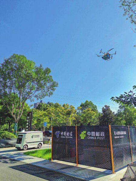 8月20日,在安徽省合肥市政務(wù)中心中國(guó)郵政無人機(jī)物流樞紐站,無人機(jī)啟程配送無人車送來的郵件。