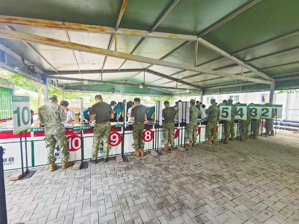 在臨時服務網(wǎng)點,官兵們用郵秩序井然。