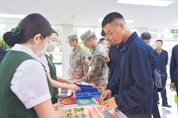 在郵政服務區(qū),官兵們正在仔細挑選郵政文創(chuàng)產(chǎn)品。