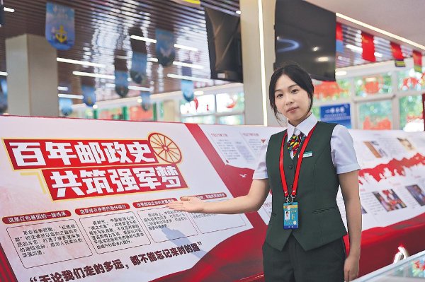 在“百年郵政史 共筑強軍夢”文化墻前,郵政工作人員為大家介紹用一枚枚郵票串聯(lián)起來的崢嶸歲月。