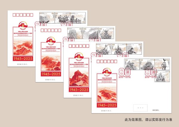 圖為《中國人民抗日戰(zhàn)爭暨世界反法西斯戰(zhàn)爭勝利八十周年》首日封和小型張首日封。(此為效果圖,請以實(shí)際發(fā)行為準(zhǔn))
