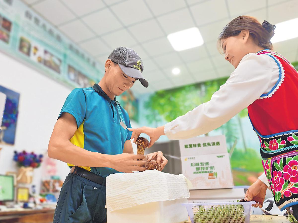 中午時(shí)分,郵政員工在交易中心商戶店內(nèi)為外銷松茸裝箱。