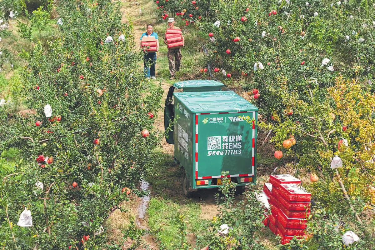 郵政員工與果農(nóng)一起歸集石榴,準(zhǔn)備批量裝車。