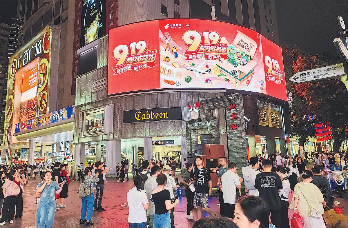 9月23日,2025年“中國農(nóng)民豐收節(jié)”拉開帷幕。當(dāng)天,“919”郵政農(nóng)品節(jié)宣傳大屏在北京、廣州、深圳、武漢、長沙、南昌、哈爾濱多地繁華街區(qū)亮相,以都市核心商圈的流量勢(shì)能,提升郵政農(nóng)品節(jié)的品牌知名度與行業(yè)影響力。圖為在廣州市北京路,“919”宣傳大屏閃亮奪目。