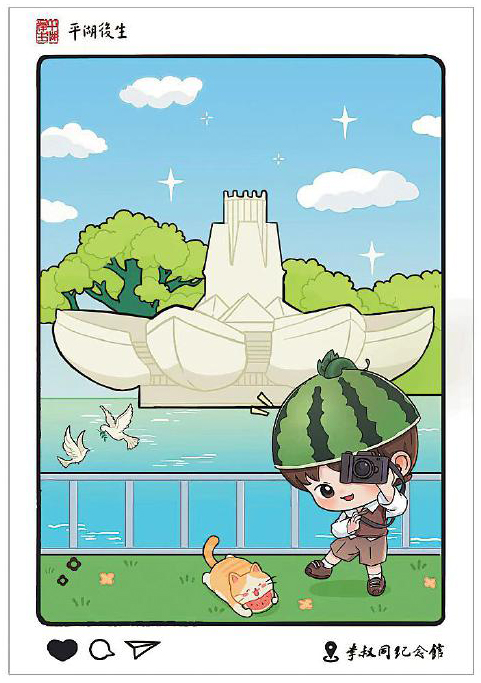 在項目推進過程中,設(shè)計團隊與平湖市委宣傳部進行了多輪溝通,最終獲得政府層面的認(rèn)可與支持。設(shè)計構(gòu)思上,團隊深入挖掘平湖地方文化資源,注重將城市肌理與精神符號融入方寸之間。彩戳及手繪明信片的圖案不僅選取了當(dāng)?shù)卮硇跃坝^,更著重突出了與一代文化巨擘李叔同相關(guān)的元素,如作為城市文化新地標(biāo)的東湖李叔同紀(jì)念館。該紀(jì)念館于今年5月完成升級并重新開放,成為集中展示李叔同生平與藝術(shù)成就的重要窗口,也為彩戳、手繪明信片設(shè)計提供了豐富的視覺素材和內(nèi)涵支撐。手繪明信片還融入了卡通人物形象,貓咪與戴西瓜帽的動漫人物形象活潑俏皮,細(xì)節(jié)處滿是巧思。