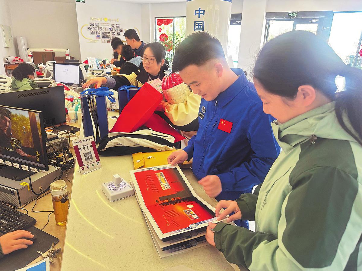 10月31日,搭載神舟二十一號載人飛船的長征二號F遙二十一運(yùn)載火箭在甘肅酒泉衛(wèi)星發(fā)射中心成功發(fā)射。為記錄中國航天事業(yè)的輝煌成就,酒泉市郵政分公司推出“2025筑夢太空”系列郵品,既具有航天發(fā)射的紀(jì)念意義,又兼顧集郵愛好者關(guān)注的收藏價(jià)值,受到各界的歡迎。圖為在酒泉航天主題郵局,客戶們踴躍選購航天郵品。