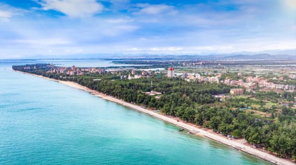 航拍萬尾金灘,森林與城市在山海間鋪展