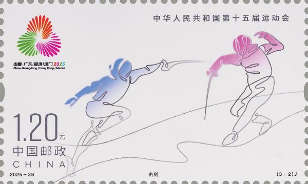 中國(guó)郵政定于11月9日發(fā)行《中華人民共和國(guó)第十五屆運(yùn)動(dòng)會(huì)》紀(jì)念郵票1套3枚,郵票圖案名稱分別為花樣游泳、擊劍、乒乓球。全套郵票面值3.60元,計(jì)劃發(fā)行數(shù)量為套票500萬套、版式二69.3萬版。