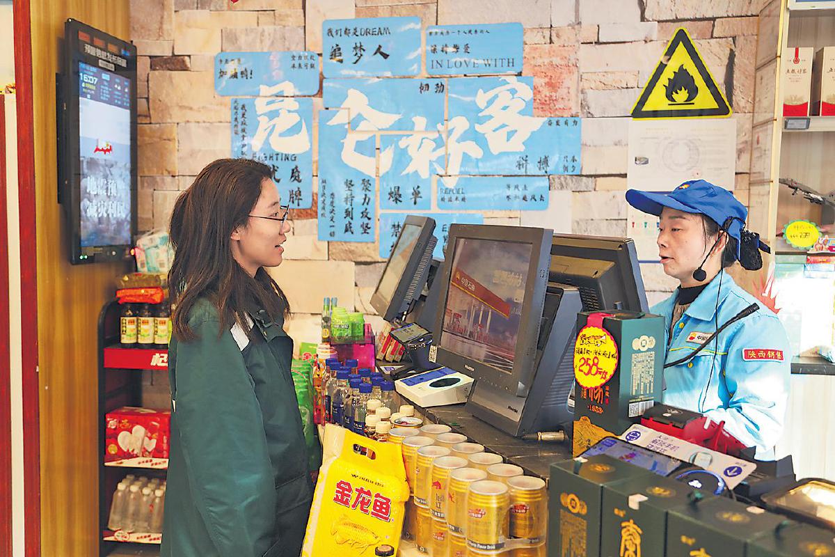 毛婉鈺(左)與“昆侖好客”便利店客戶交流。