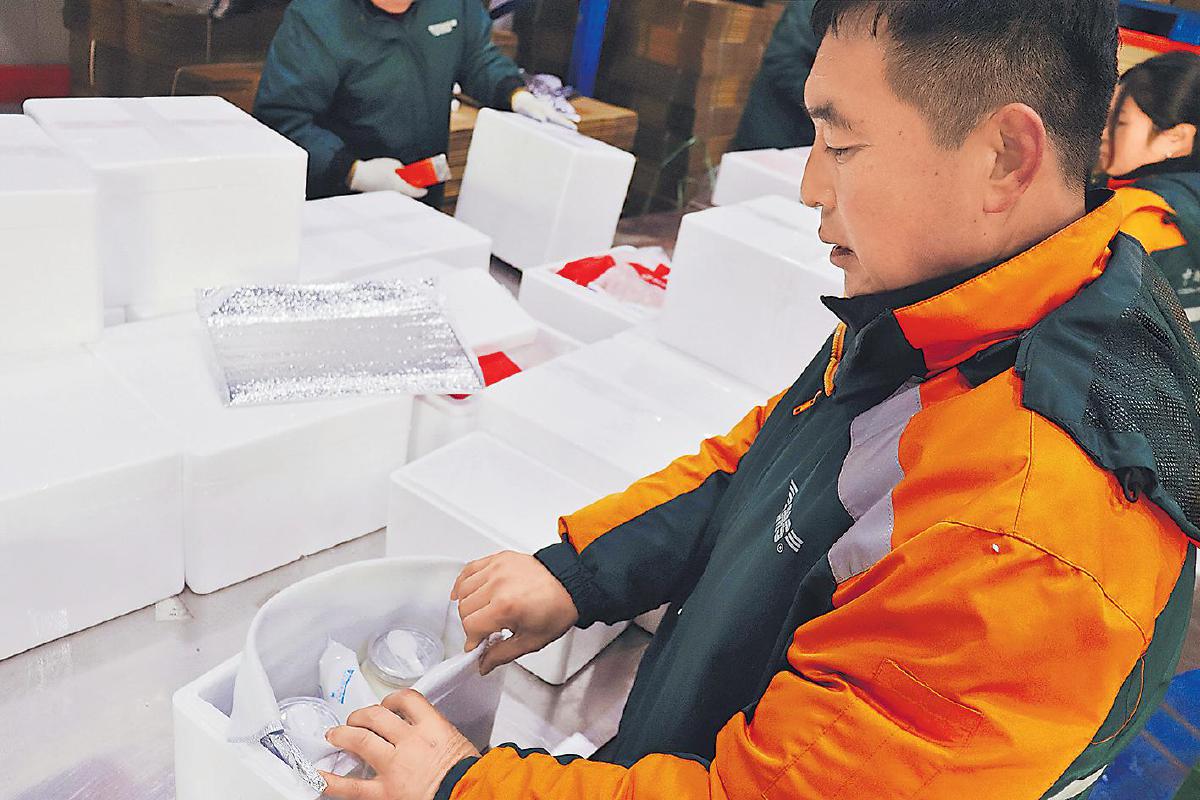 郵政工作人員在打包“極速鮮”郵件。 □卜媛媛 攝