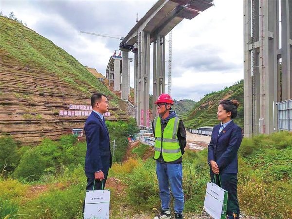 郵儲銀行平?jīng)鍪蟹中泄ぷ魅藛T在高速公路施工現(xiàn)場走訪。