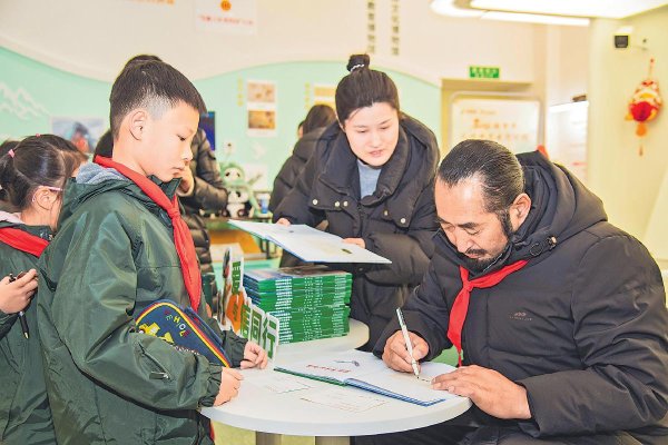 活動尾聲,其美多吉與兒童郵局的師生,在點綴著馬年新春元素的郵局前并肩合影。鏡頭定格下一張張燦爛笑臉,孩子們眼中被榜樣精神點亮的光芒,比現(xiàn)場的年味裝飾更顯耀眼。(圖為贈書環(huán)節(jié),其美多吉為學(xué)生在繪本上簽名。)