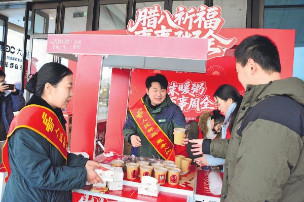 1月26日,江蘇省射陽縣郵政分公司聯(lián)合共建單位——中聯(lián)社區(qū)、吾悅廣場置業(yè)公司,在吾悅廣場開展“臘八祈福,事事粥全”活動(dòng),免費(fèi)向快遞小哥、出租車駕駛員、環(huán)衛(wèi)工作者等500多名群眾送上可口的臘八粥和面巾紙,并向他們送上節(jié)日祝福,讓節(jié)日的溫暖在街頭巷尾流淌。