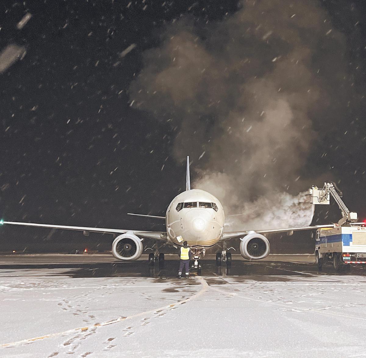 1月29日深夜,郵航機(jī)務(wù)人員在新疆石河子花園機(jī)場(chǎng)指揮除冰車噴灑除冰液,保持飛機(jī)適航狀態(tài)。1月4日,石河子至南京“極速鮮”航線開通,助力當(dāng)?shù)剀妷ㄞr(nóng)牧產(chǎn)品走向全國。面對(duì)冬季的寒冷與降雪,郵航機(jī)務(wù)團(tuán)隊(duì)克服天氣影響,以專業(yè)維護(hù)確保航班不受低溫影響,守護(hù)著連接牧場(chǎng)與市場(chǎng)的“空中橋梁”。