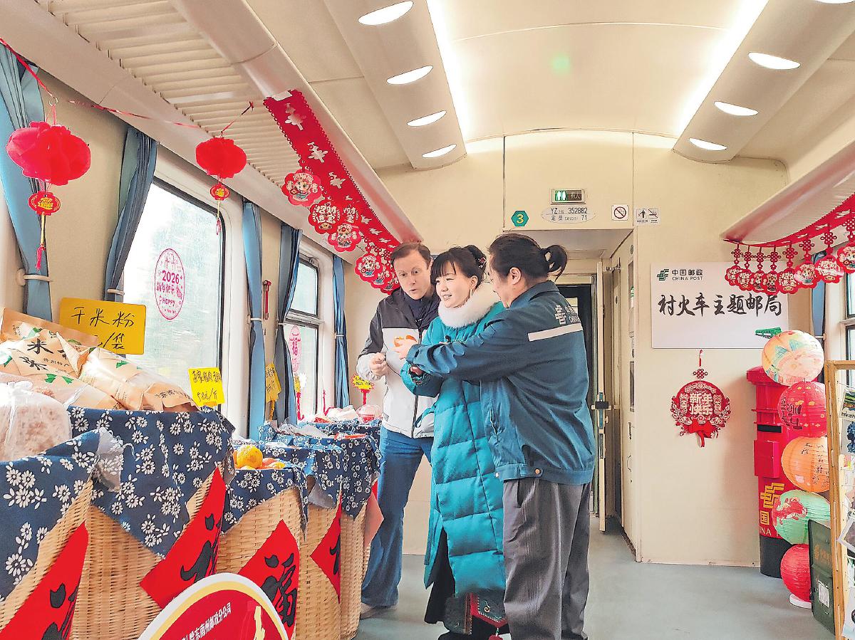 “快幫我蓋一枚‘村火車’限定郵戳,我要免費住民宿!”“我還是第一次在‘村火車’上趕大集,買地道年味,這個活動辦得真有意思!”2月8日,滬昆普鐵貴州東段的5640次綠皮火車5號車廂里,貴州省黔東南苗族侗族自治州郵政分公司打造的“村火車”主題郵局“年貨節(jié)”火熱開啟,“郵”來濃濃年味。
