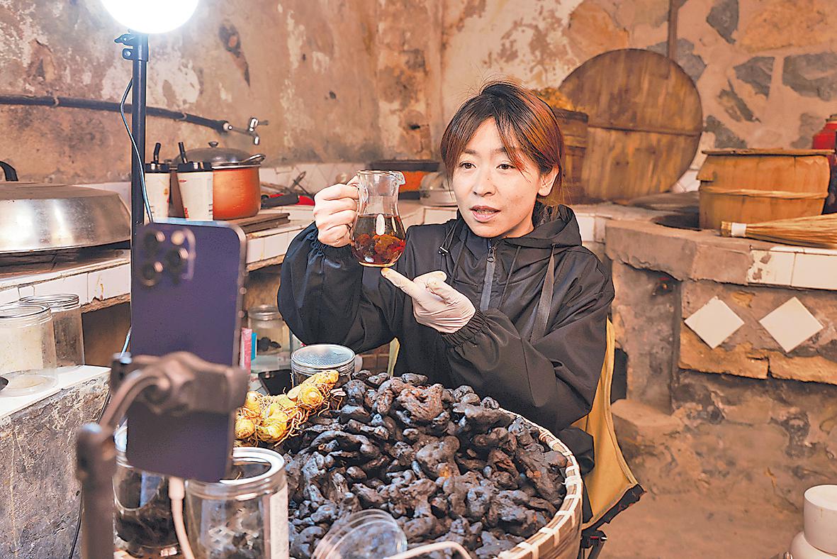 在景寧縣鸕鶿鄉(xiāng)徐崇村,清晨的薄霧還未散盡,主播“@鄉(xiāng)村夏天”的直播間已經(jīng)熱鬧起來了,直播鏡頭對(duì)準(zhǔn)從村民手里收購來的剛蒸曬好、泛著烏潤光澤的九制黃精。主播拿起一片黃精,對(duì)著燈光展示其飽滿厚實(shí)的肉質(zhì):“家人們快來看?。∵@就是我們山里遵循古法、九蒸九曬后正宗黃精的模樣,黑如漆、亮如油,口感糯甜,補(bǔ)力醇厚……”只見她輕輕掰開,深褐色的斷面透著晶瑩的質(zhì)感,湊近鏡頭,仿佛能聞到那股獨(dú)特的藥香與甜香交織的氣息。評(píng)論區(qū)瞬間被點(diǎn)燃:“這才是地道貨!”“上次買來燉湯,全家都說好!”“今天能發(fā)嗎?老客戶都等著這批好貨呢!”……一旁,主播的父親老練正根據(jù)手機(jī)里不斷跳出的訂單信息,麻利地將黃精稱重、包裝、入箱。
