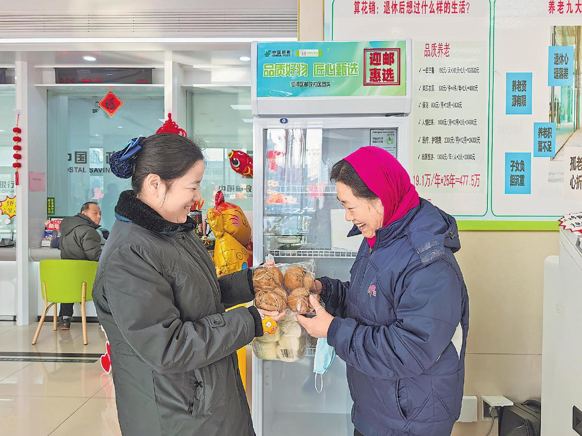客戶到郵政網(wǎng)點(diǎn)自取團(tuán)購預(yù)訂的饅頭。