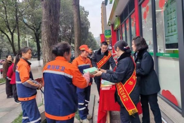 郵儲銀行南川支行工作人員為環(huán)衛(wèi)工人送上熱茶(郵儲銀行供圖)