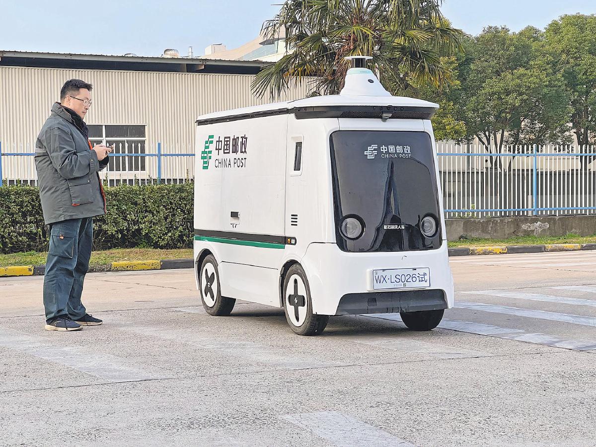 蘇州郵政工作人員操控?zé)o人車。