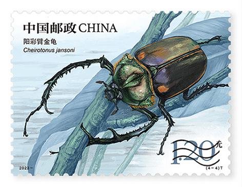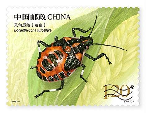 2023年發(fā)行的《昆蟲(二)》郵票,首次采用七彩變色透明薄膜燙印技術(shù),利用局部燙印賦予昆蟲奇妙的顏色變化,呈現(xiàn)昆蟲殼體的自然變色屬性。本套郵票采用五色膠印印制,附加三維起凸和燙印工藝增強(qiáng)郵票印刷效果,展現(xiàn)出逼真的視覺效果。本套郵票還采用了無色白熒光、特殊形狀異型網(wǎng)點(diǎn)等多種防偽技術(shù)。