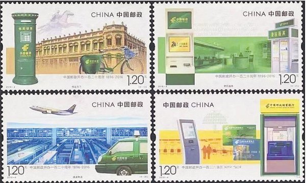 2016年3月20日,中國郵政發(fā)行《中國郵政開辦一百二十周年》紀(jì)念郵票1套4枚(圖4),展現(xiàn)了中國郵政的悠久歷史及現(xiàn)代化發(fā)展。第1枚郵票“信達(dá)天下”選用清代郵政天津局舊址、古代驛使雕塑、郵政自行車、郵筒等元素,展現(xiàn)了中國郵政120年的歷史畫卷,傳遞了中國郵政“信達(dá)天下”的歷史使命。第2枚郵票“便民服務(wù)”選用郵政服務(wù)大廳、便民服務(wù)站、易郵柜等元素,表現(xiàn)了中國郵政努力踐行“便民服務(wù)”的理念。第3枚郵票“速遞物流”選用現(xiàn)代化速遞物流集散中心、郵運汽車、飛機(jī)等元素,凸顯中國郵政速遞物流方便快捷、安全可靠的優(yōu)勢。第4枚郵票“普惠金融”選用郵政儲蓄銀行營業(yè)廳、ATM機(jī)、郵政銀行卡(借記卡和信用卡)、中郵保險形象等元素,傳達(dá)“進(jìn)步與您同步”的服務(wù)理念,凸顯“普惠金融”的行業(yè)使命。為配合相關(guān)紀(jì)念活動,中國郵政還利用當(dāng)年發(fā)行的《年年有余》和《喜臨門》賀年專用郵票,印制《中國郵政開辦一百二十周年紀(jì)念》小全張1枚(圖5)。