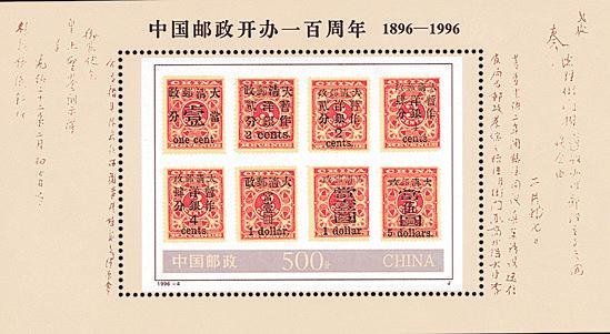 1996年3月20日,中國郵政發(fā)行《中國郵政開辦一百周年》紀(jì)念郵票1套4枚、小型張1枚。4枚郵票(圖1)選用清代天津郵政津局舊址、北京郵務(wù)管理局舊址、中華蘇維埃共和國郵政總局舊址、北京郵政樞紐4座不同時期的郵政建筑為主圖,回顧了百年郵政的滄桑,烘托了主題。4座郵政建筑風(fēng)格迥異,既有民居樣式,又有現(xiàn)代化建筑,為了在形式上進(jìn)行統(tǒng)一,設(shè)計者根據(jù)建筑外觀的特點,在橫形票幅的基礎(chǔ)上,上下各加一條灰邊,圖案上方的灰邊上印有郵票圖名和徽記,下方的灰邊擺放國銘、面值、郵票志號等。郵票畫面視角開闊,猶如一幅完整的建筑畫長卷,體現(xiàn)了韻律美。每枚郵票右上角的郵電徽志與左下角的綠色面值相呼應(yīng),強(qiáng)調(diào)了郵資憑證的屬性。小型張(圖2)郵票以分兩行排列的全套8枚清紅印花加蓋郵票為主圖,邊飾則展示了1896年3月20日清總理衙門議辦郵政折及光緒皇帝的“依議欽此”御批。紅印花加蓋郵票是清代國家郵政開辦后發(fā)行的第一套郵票,也是世界珍郵,用它作為小型張郵票主圖,不僅點明了中國郵政開辦百年的紀(jì)念主題,也展示了中國珍郵的風(fēng)采。