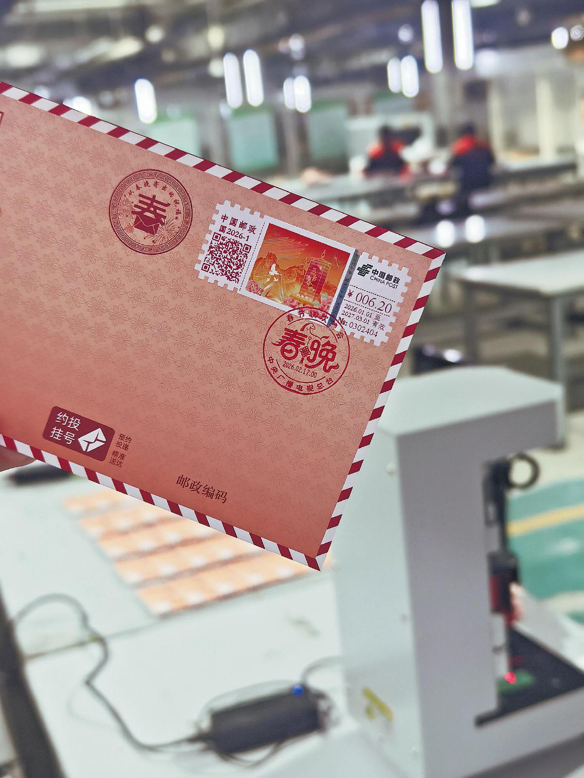 自1月初至除夕當(dāng)天,所有通過線上下單的“2026年春晚寄?!奔o(jì)念封套裝,正陸續(xù)在這里完成打印、封裝、蓋戳和郵寄。