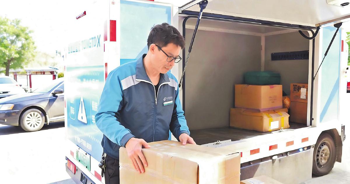投遞員將包裹放進無人配送車。□歐陽錦 攝